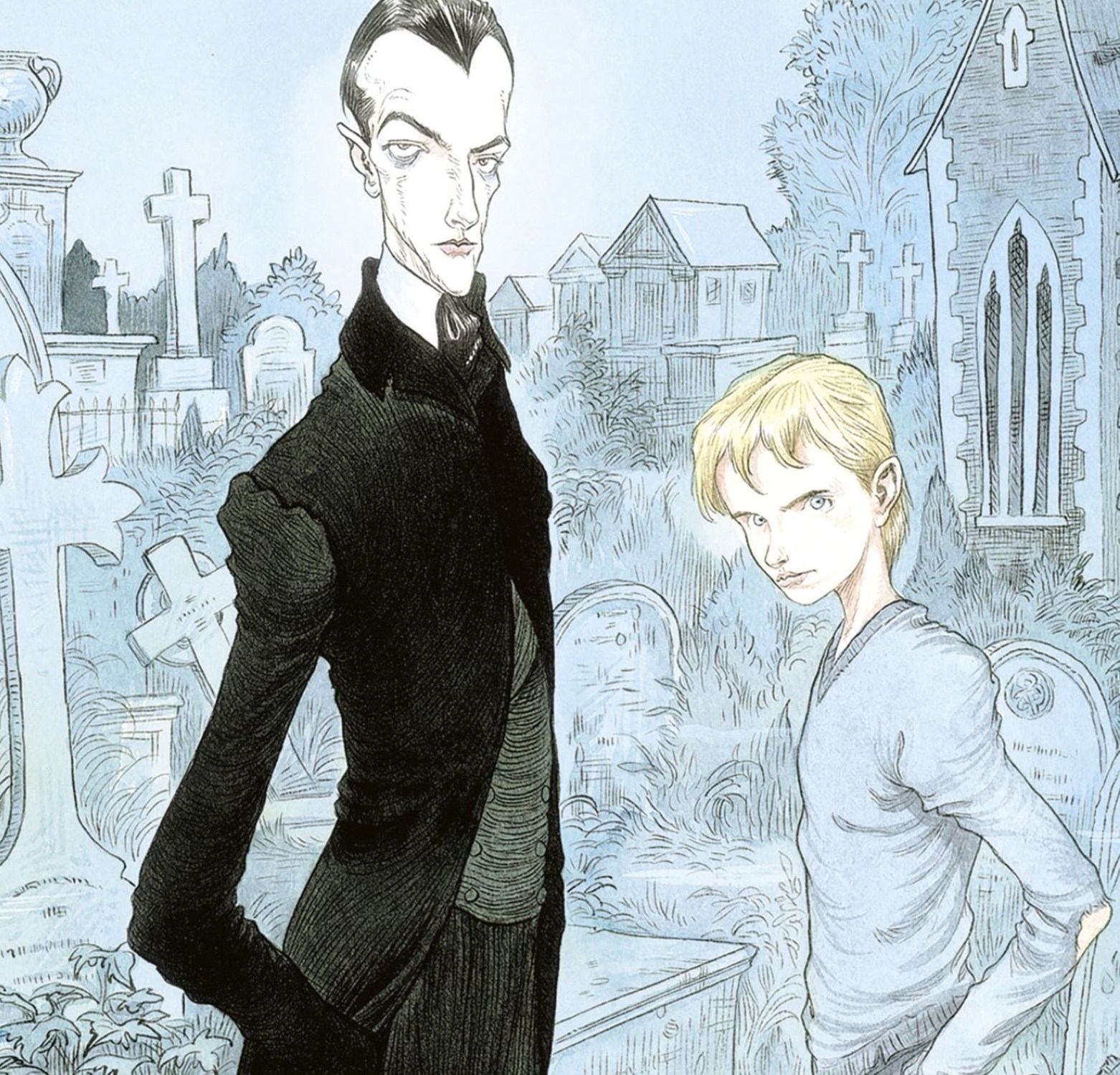 El cementiri, inspirat en el Highgate Cemetery West de Londres, acull unes deu mil ànimes, però la majoria dormen profundament. En Ning gaudeix de la seva vida de nen amb la gran família del cementiri, des del romà Gai Pompeu, un dels habitants més antics perquè fa dos mil anys que hi és, a la misteriosa bruixa del segle XV, o el poeta del XVIII. Els vius no poden veure els fantasmes, però en Ning sí i, amb el temps, va aprenent tècniques fantasmals bàsiques, com l’art d’Esvanir-se, d’Esmunyir-se i d’Entrar en els Somnis…